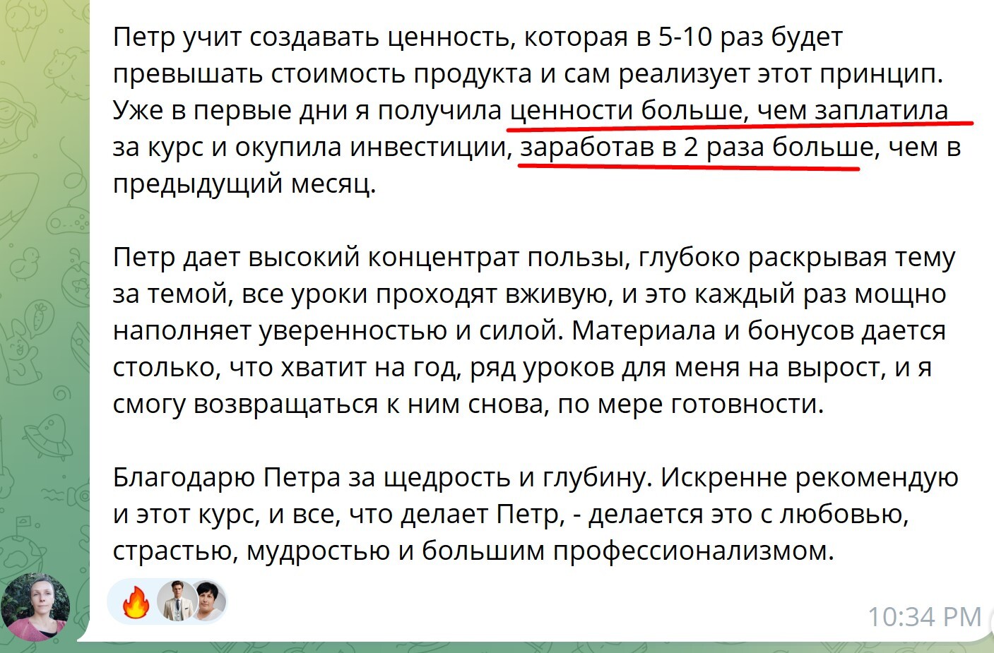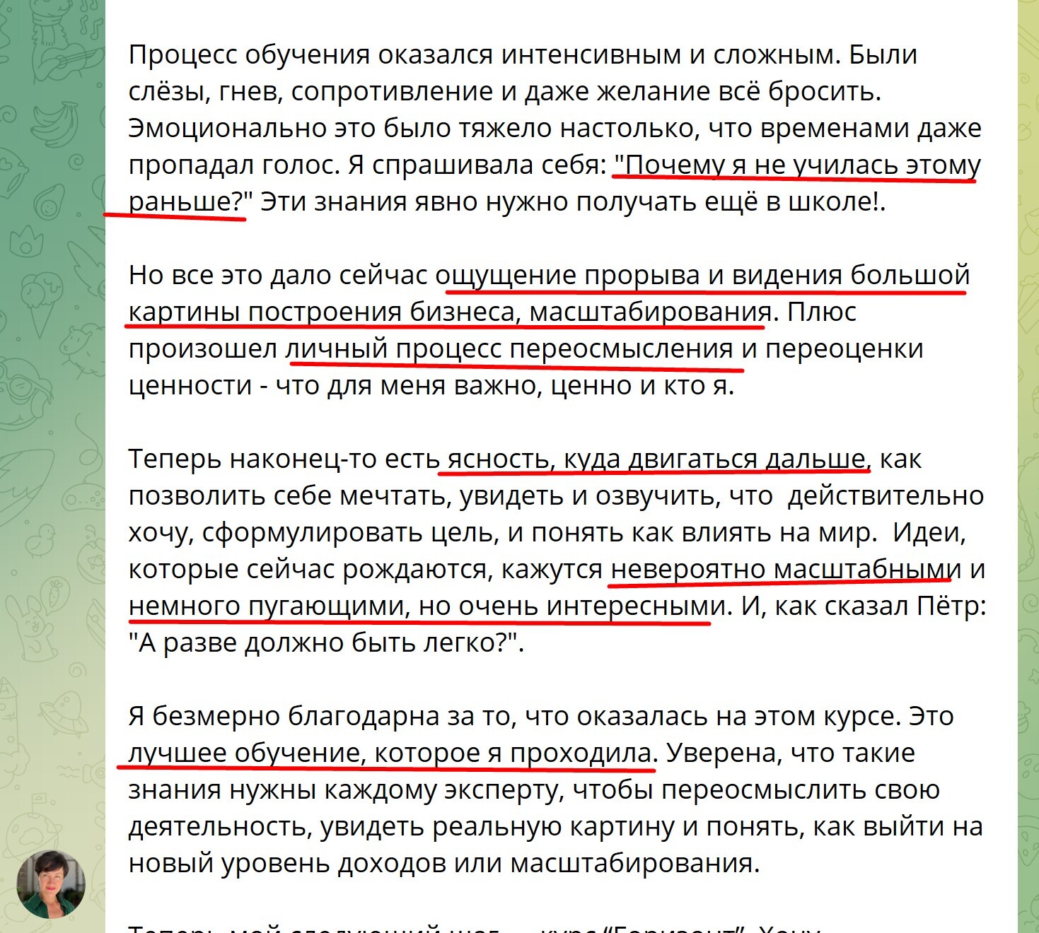 В отзыве есть несколько важных для меня моментов. Алексей четко формулирует важный момент - что работа со мной, это не про розовые пони и ветряные мельницы. А работа на конкретный результат. Через мощные трансформации убеждений, навыков и освоении новых инструментов на больших скоростях.