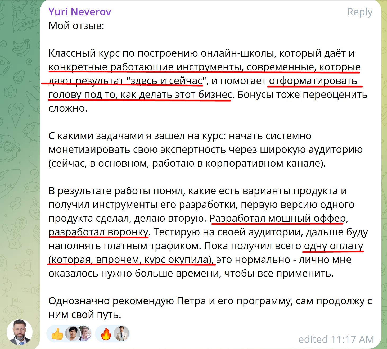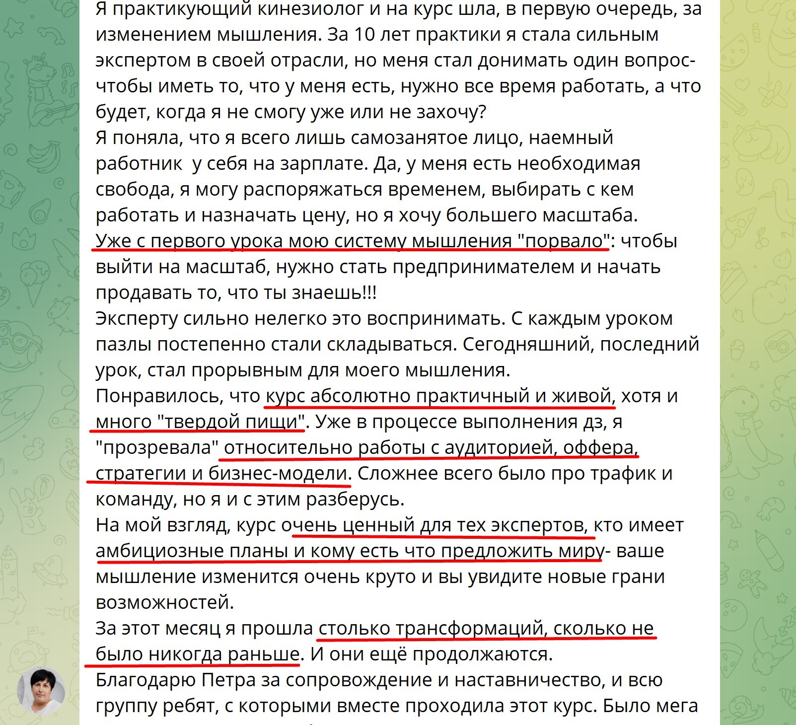 Проблема помогающих практиков в том, что работая "на себя" они не могут масштабировать свои результаты. Натыкаясь на ограничения своего времени и компетенций. Есть множество курсов, которые предлагаю создать "волшебные воронки", которые "работают сами по себе", и нужно всего лишь проводить консультации, и продавать практику, но в реальности это абсолютно не рабочая схема. За последние 10 лет я помог десяткам экспертов превратить свою практику в твердый, системный бизнес. И секрет здесь не в "секретных шаблонах", а в трансформации мышления от мышления специалиста в мышление предпринимателя, и прокачке управленческих навыков, вместо навыка маркетолога. Этот курс для экспертов с большими амбициями, которые готовы к переменам, чтобы системно помогать радикально бОльшему количеству своих клиентов, делать это системно, прогнозно и управляемо, зарабатывая достойны деньги. |